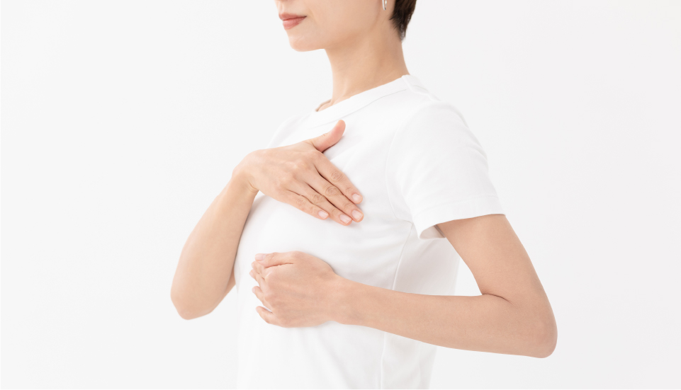 鏡を見たら乳房の表面が凹んでいた、触ってみたらしこりに触れた、乳頭から赤褐色の分泌物が出たなどの自覚症状で発見される乳がんもありますが、これらの自覚症状が出てからでは病状が進行していることが多いです。自覚症状のないうちに乳がん検診をすることをおすすめします。また、ご自身で自己検診をされることも早期発見につながります。閉じる
